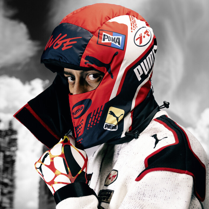 The only driving gloves you’ll ever need. Inspired by racing gloves, this pair has an oversized fit with a heat map printed in silicone on the palm. A moulded silicone print on the back of the hand mimics veins, while badges from the collection are featured on the fingertips, inspired by Rocky’s nail art.